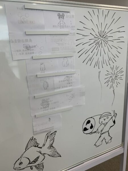 お題は生徒さんが決めたのですが、「おばけ」、「カメ」とわかりやすいものもあれば、「ドラえもんミッキー」や「ワンピースのルフィーの象徴」「名探偵コナンの蘭姉ちゃん」といった面白いものもありました!!
