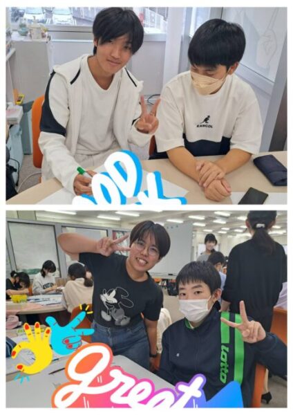 その後、体育祭で使用する借り物競争お題用紙を作りました!アートサークルらしく、文字だけでなく、ちょっと装飾も入れよう!ということになり、文字を書く担当、イラストを描く担当と役割分担をして作業を進めました😉