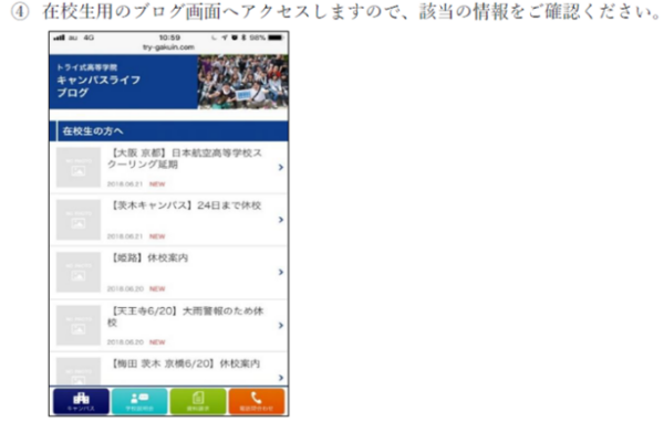 トライ式高等学院では、台風地震発生などの緊急時、休校や学校行事の中止・延期などの変更がある場合には、オフィシャルブログにて最新情報をご案内しております。