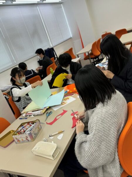 意外と広いブース用の装飾を作ります!やっぱり数が必要なので、空きがある生徒でチョキチョキ貼り貼り!
