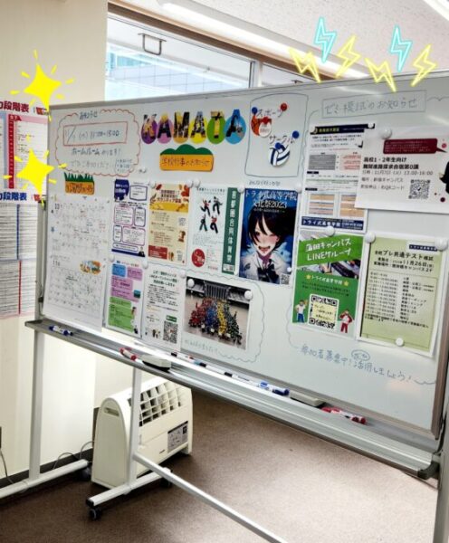 蒲田キャンパスでは、教室のホワイトボードに行事を掲示しています。