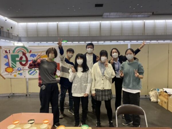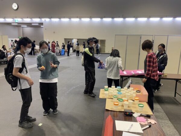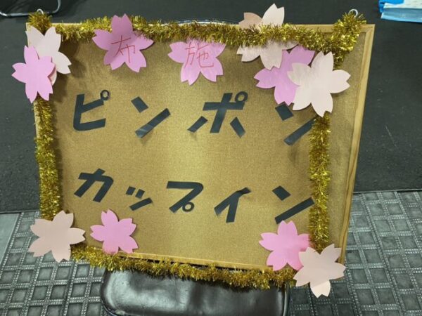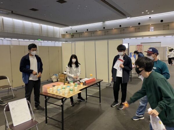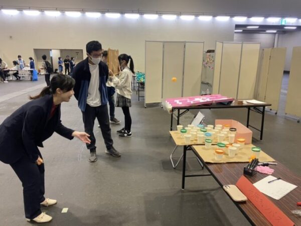 布施キャンパスの模擬店は、紙コップにピンポン玉を投げ入れて点数を競う「ピンポンカップイン」!