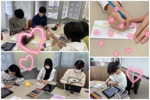 これらのハガキはボランティアセンターへ提出し、ヘルパーサークルさんを通して、高齢の聴覚障害のある方々に届けられます。きっと喜んでいただけると思います💕引き続き、今月いっぱいはメッセージを集めたいと思っているので、岐阜キャンパスのみなさん!アートサークルの時間以外でもメッセージを書いてどんどん持ってきてくださいね🎵みんなでたくさんのあったかい💕を届けましょう~😉