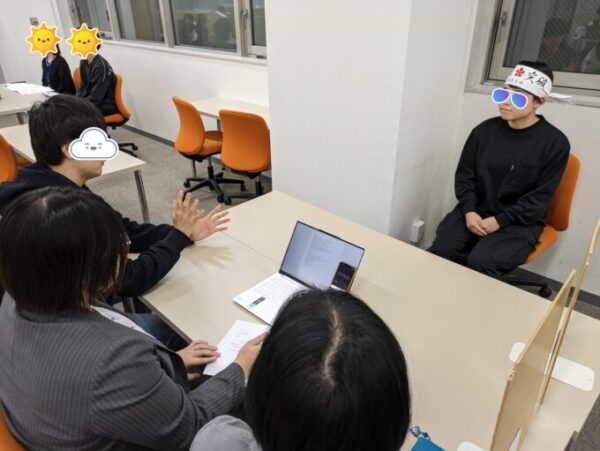面接官役の3人からかなり突っ込んだ質問を受けているSさん、ハチマキで合格に向け気合を入れつつ練習!