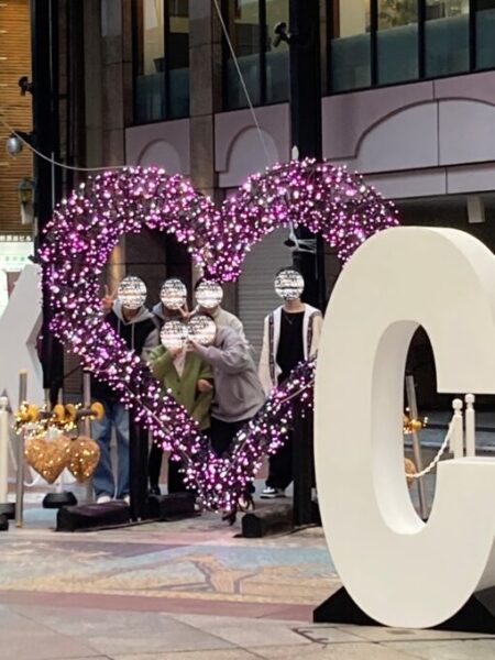 ボランティアの帰りには、ライトアップされた商店街で仲良しショットを撮りました。