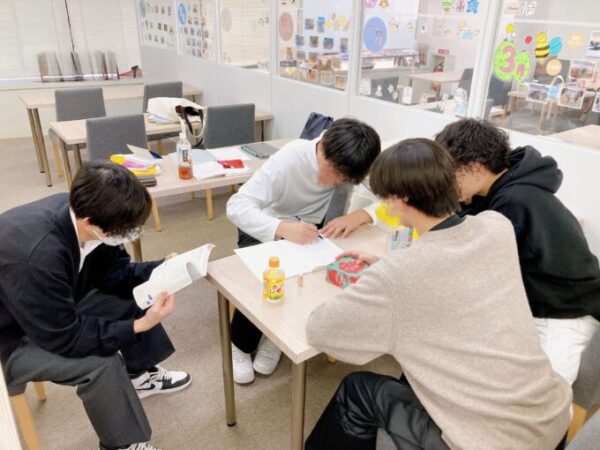クリスマスパーティーの話し合いをする男子たち。