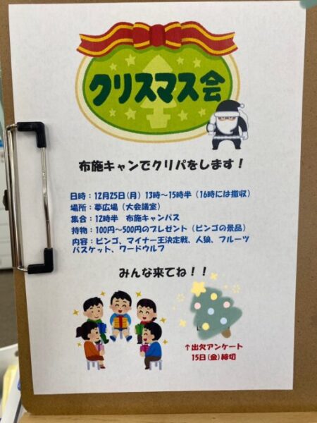 キャンパスにいた生徒たちで集まり、クリスマス会になにをやるか計画しました🎄