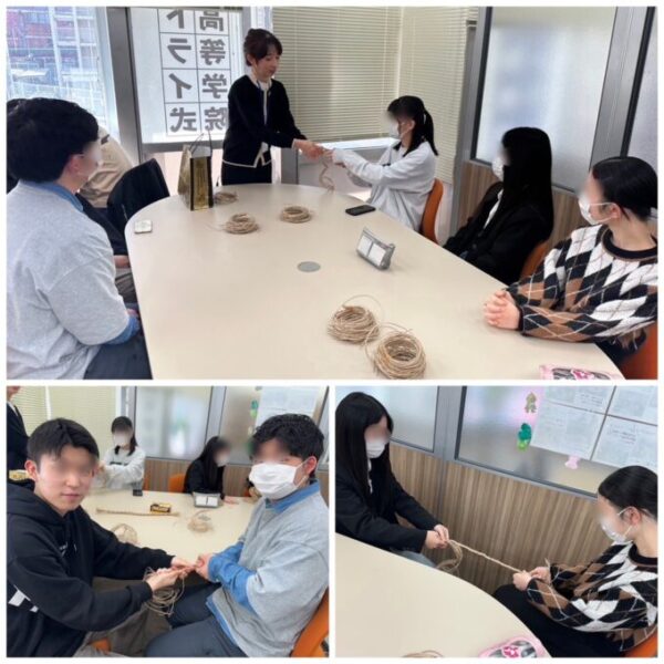 本来しめ縄は藁を用いて足を使って作りますが、今回は紙紐を使用し、二人一組で作業することにしました。縄を作るには少しコツがいるため、あらかじめ数人の生徒さんに午前中に覚えてもらい、他のみんなに教えるレクチャー係をお願いしました✨✨
