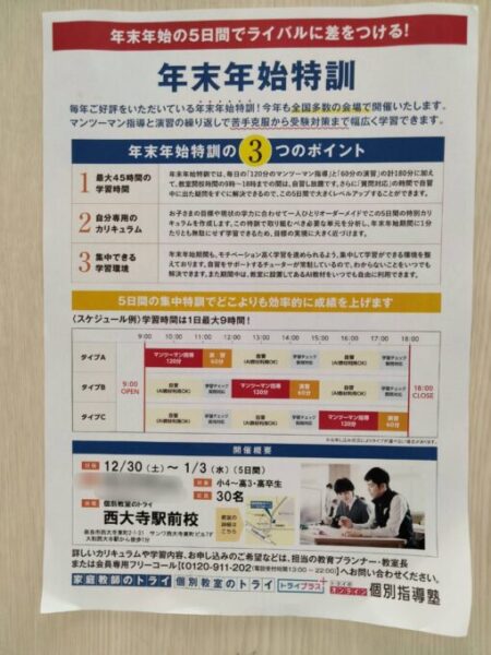 そのため、やはり学習量の確保は必須になります。勉強量が不安…、本番に向けて少しでも苦手科目を克服したい、家では集中して勉強ができない等、そんな方々のために≪年末年始特訓≫をご用意しております!