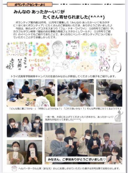 嬉しいご報告です💖アートサークルのみんなで参加した『みんなのあったか~いをカタチに!ほくほくボランティア』の様子が、岐阜市ボランティアセンターの発行する『ボランティア案内板』に掲載されました✨✨