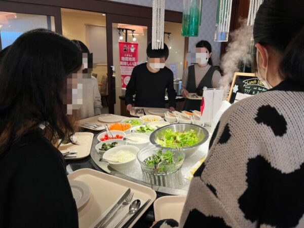 ビュッフェ会場には、自家製カレーやサラダ、から揚げ、回鍋肉、パンや自分で作れるアイスクリームの機械などもあり、思い思いに料理をお皿に盛りつけていました😋🍽️
