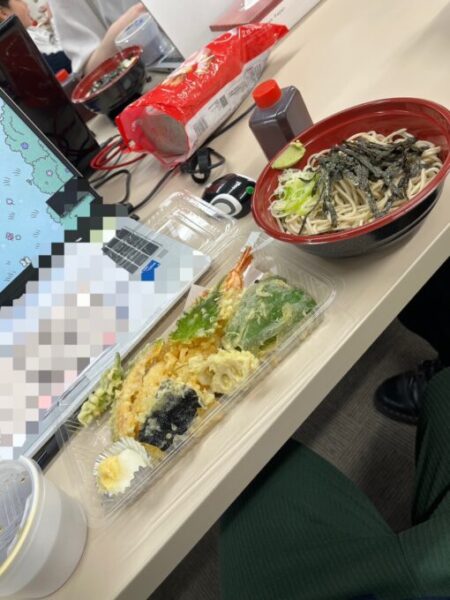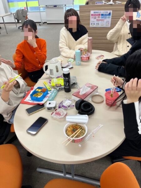 こちらのテーブルではカップラーメンのそばがありますね!普通のお弁当を広げている子もいますね(笑)