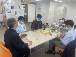 最近は12時から30分はみんなで食事、12時30分からはゲーム、と時間を区切って行っています!