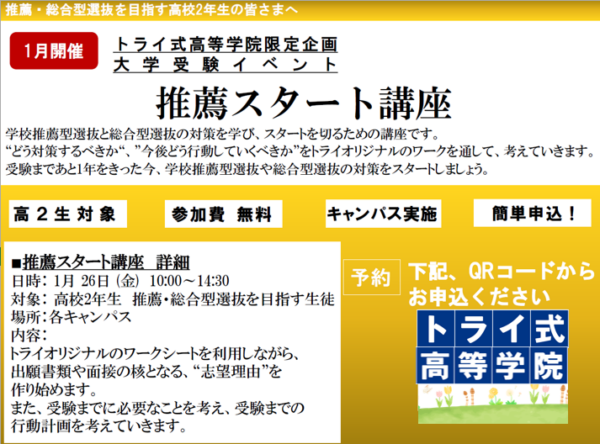 全国のトライで一斉に始まる講座です。このあと続きます『推薦対策合宿』にスムーズに参加するために非常に大切なスタートになりますので、高校2年生のみなさんは原則参加しましょう!