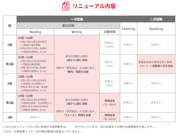 2024年度第1回検定より、英検の1級、準1級、2級、準2級、3級を対象にリニューアルが予定されています。