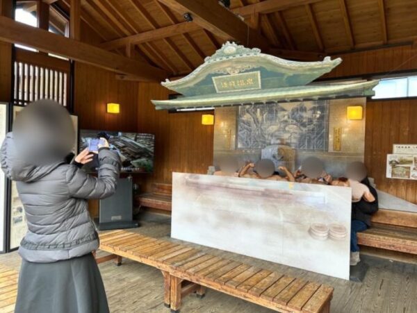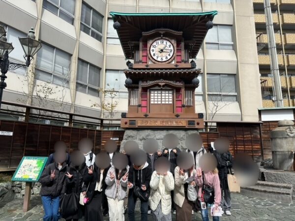 カラクリ時計前と飛鳥乃湯泉で集合写真を撮った後