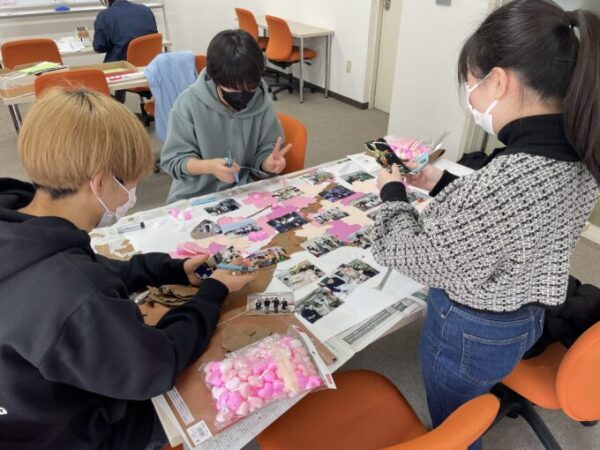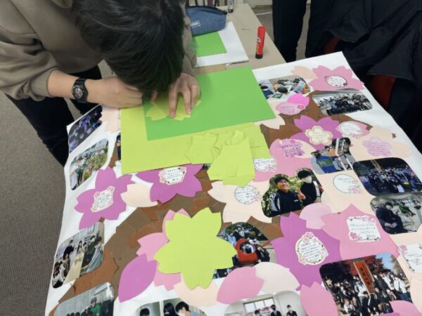 卒業式の会場内に展示する「桜の木」を広報委員会のみんなが