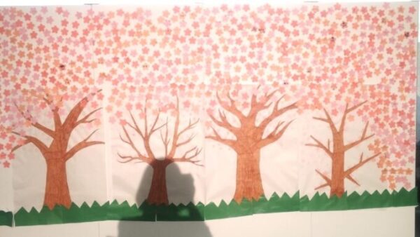 桜の花びらに書かれた、在校生や講師の先生方からのたくさんのメッセージが飾られて、