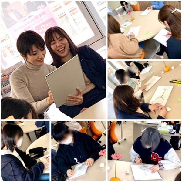 松枝キャンパス長、とっても楽しそう!先生が描くポイントやコツを回りながら、個々に指導もしてくださいました。そんな中で「上手に描こうとがんばらなくても大丈夫!絵を描くこと自体を楽しんでくださいね。」と優しく声掛けしてくださるのが印象的でした。