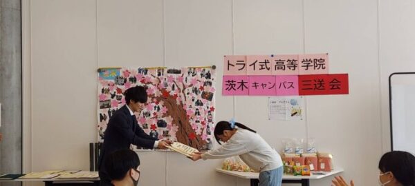 三送会では、毎年恒例「ミニ卒業証書授与式」として会の初めに連携校の卒業証書の授与を行います。