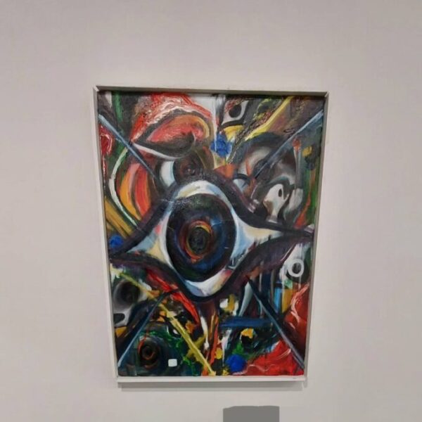 Nくんのコメント(一部):自分の進むべき道がわからず、悩むなかで自分が何をしたいのか、何をすべきなのか自分でも分からなくなることが何度もありました。何かが違うと自分で自分を否定する連続でした。どこからともなく生まれる不安と満足できていないという感覚。しかし、何かやってやろうという漠然としながらも大きなエネルギーがありました。日によって変わる感情、それを絵にも表し、具体的なモチーフを置く日もあれば勢いに任せた線を引く日も。自分が気に入らなくなるような日は塗り潰したりもしました。最後に今の状況に満足していない、変えていきたいという思いの象徴として今まで描き進めた絵を塗り潰して壊すような形でまっすぐ見開いた大きな目玉を中心に描き入れました。