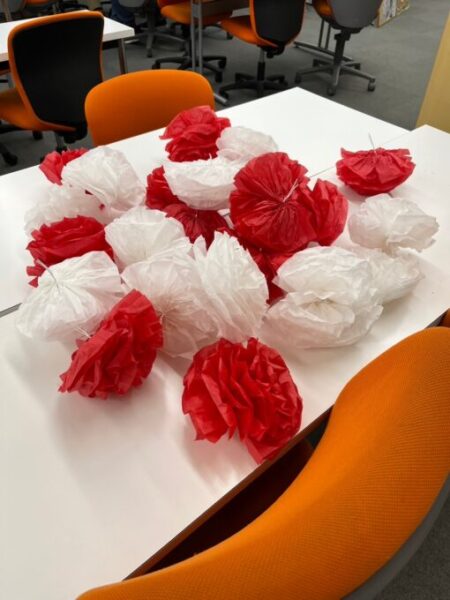 飾り付けを作成中に生徒のみんなが手伝ってくれて無事すべて作り終えることが出来ました👍