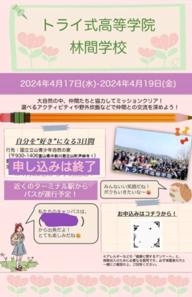 春の林間学校を4/17(水)~4/19(金)に開催します❗