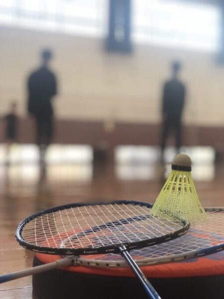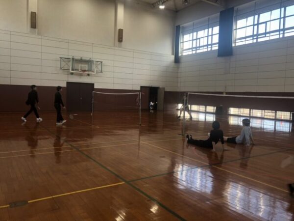 みんなと初めましての緊張のなかなれない手つきでバドミントンをしていました。