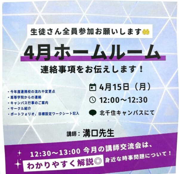 🌈4月15日(月)12:00から、ホームルームを行います🌈