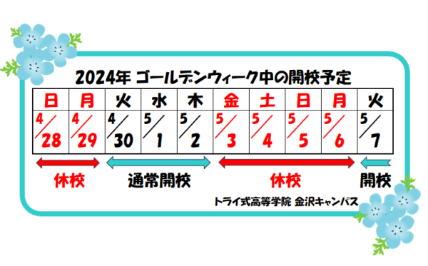 ゴールデンウィーク期間中の開校と休校のお知らせです。
