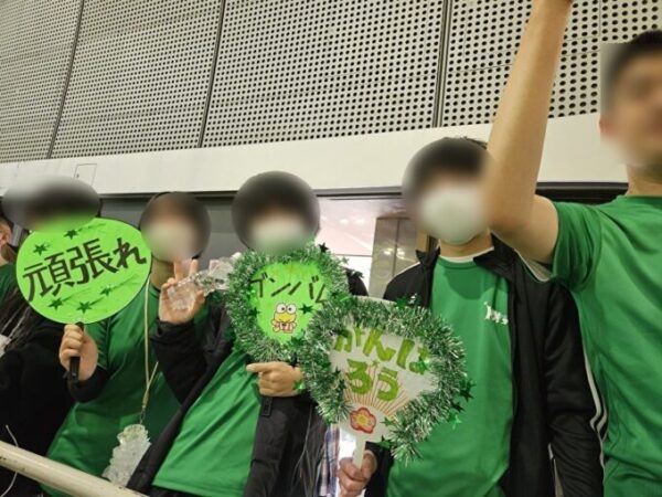 緑のTシャツ、そしてキャンパスで作った緑のグッズを持って応援です。