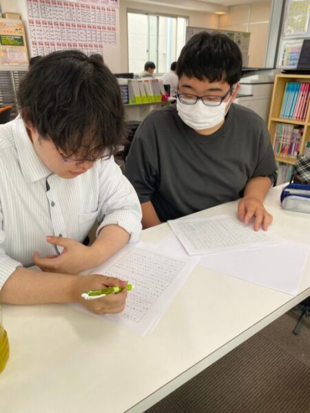 茨木キャンパスの高3、Hくんは早速書き上げた原稿を学生スタッフに添削をお願いしています✏