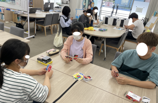 写真奥がチームプレゼンの打ち合わせ、手前は毎週木曜日恒例のレクレーション部の活動でUNOをしています。