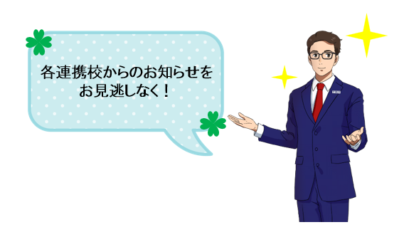 各連携校については毎月実施されるHRにて詳しく案内をしています。大変重要な内容も含まれますので、必ず出席しましょう。(7月のHRは7月12日を予定しています)