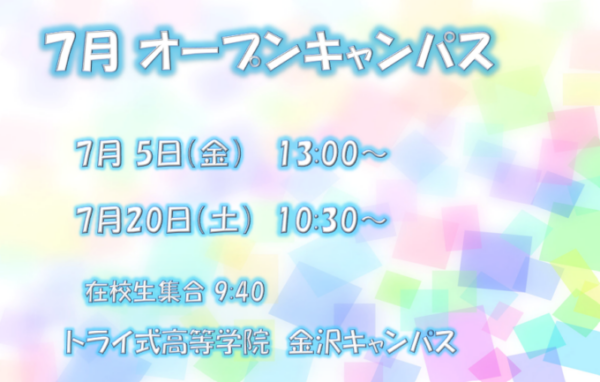7月のオープンキャンパスは 5日(金)13:00~ ,20日(土)10:30~ です。
