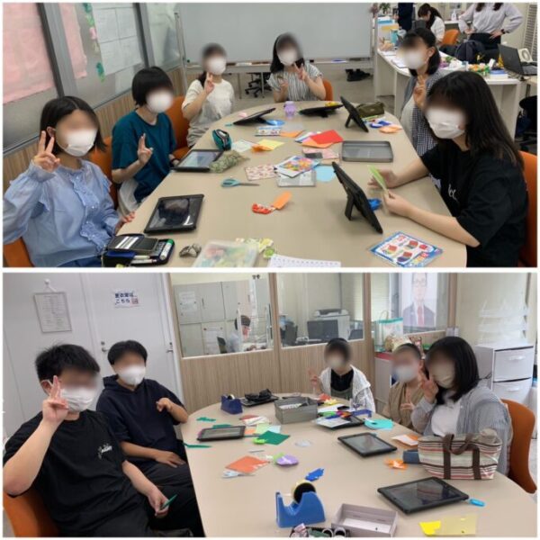 スタート時間、今月は参加人数少な目だなぁなんて、思っていましたが、徐々に参加者が増え、円卓2つを使っての作業となりました!7月といえば、やっぱりメインイベントは🎋七夕🎋ですね🎵いまやアートサークルのエース3年Nちゃんを筆頭にみんなでかわいいモチーフを折り紙で折っていきます✨✨
