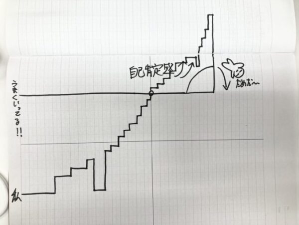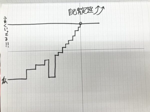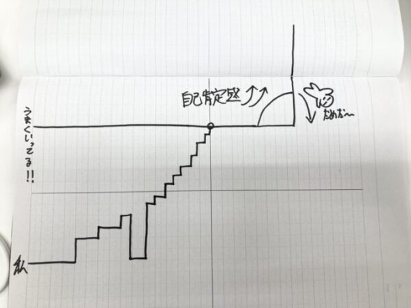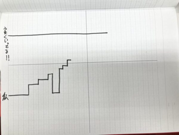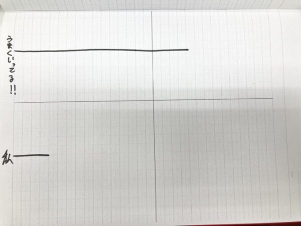 これを見てください。上の線が、これまでの人生うまくいってきた人たちです。そして下の線が当時のわたし。勉強も、人間関係もうまくいっていませんでした。