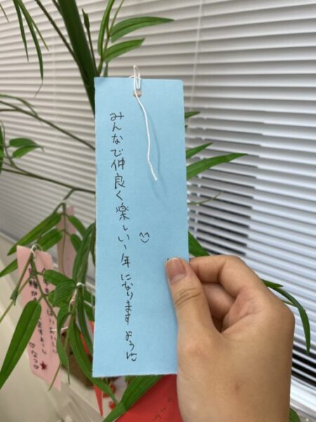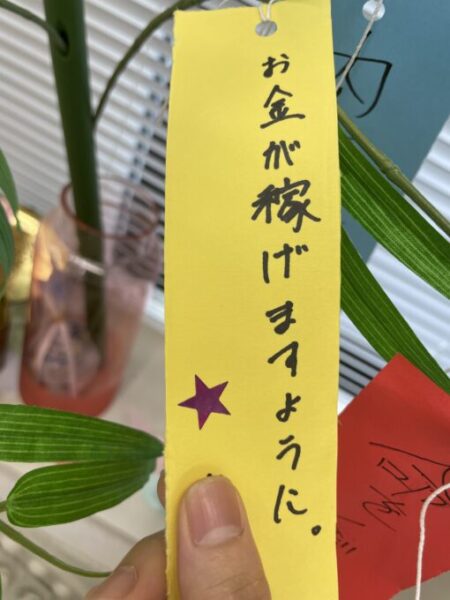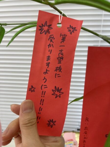 来月は七夕ということで、笹を飾って短冊にお願い事を書きました。