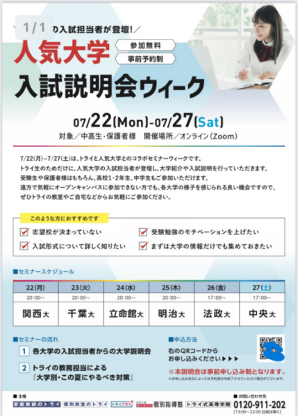 二つ目、三つ目は大学とのタッグです。まずは、「人気大学 入試説明会ウィーク」!トライ生のために、大学の入試科の皆様をお招きして行う6日間です。千葉大学や明治大学、立命館大学など、東西の有名大学が説明会を開催してくれます!オープンキャンパスに足を運ぶのはまだ大変...。という皆さん、ここから参加してみてください!