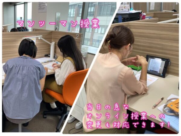 マンツーマン授業のフロアと自習室のフロアがつながっています!授業はすべて1対1。教室の奥側がマンツーマン授業ブースです。