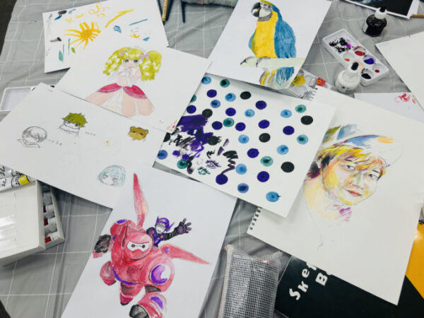 今月の所沢キャンパスのイベントは「画材に触れよう!」ということで、絵をかいてポスターカラーとドローインクで色塗りしました。