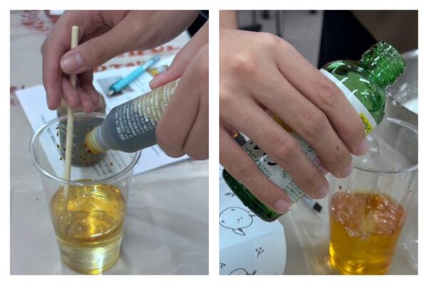 水にうがい薬を入れると茶色🟫、そこにビタミンC飲料🍋を入れると…?
