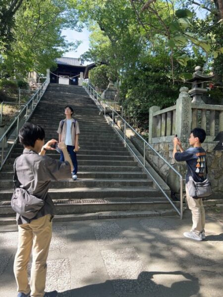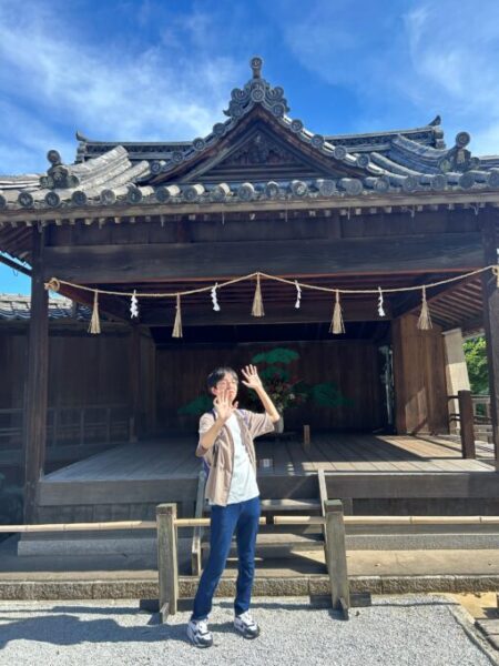 じゃんけんで勝った人が能舞台の前で決めポーズしようよ、という無茶振りに見事勝利したYさん。