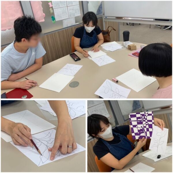 先生が用意して下さった原画より少し大きめの紙に書き写してみます。原画と自分の描く用紙に、同じように縦・横・斜めに直線を引き、その線に対して、イラストを点で捉えていきます。今回のイラストは植物なので、捉えた点と点を柔らかい線で結んでいきます。数学が得意なY君は先生が用意した線にさらに細かい線を足して、確実に点を捉えるよう工夫しながら描いていました😉