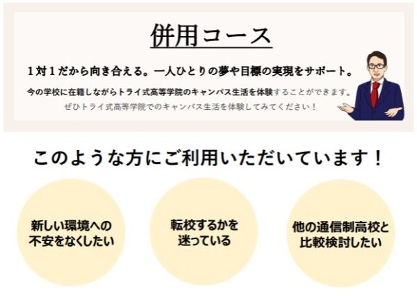 トライ式高等学院には、在籍されている高校に所属したままトライの生活を体験できる【併用コース】がございます(*^^*)