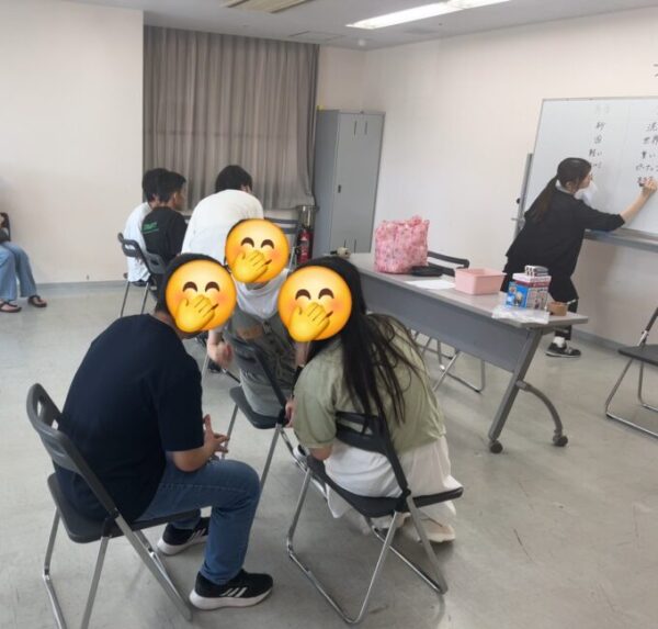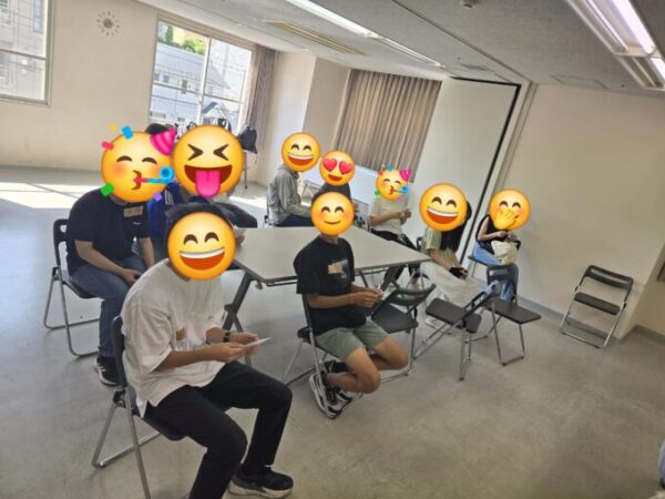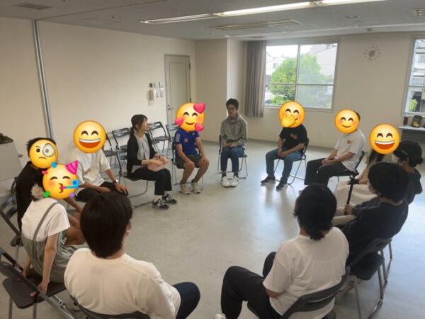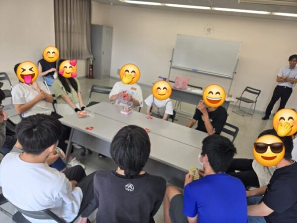 参加者には円形に座ってもらい、時計回りに1人ずつ自分の名前、学年、お題ネタを言います。2人目以降は、ただ自分の名前を言うのではなく、自分よりも前に並んでいる人全員分の名前、学年、お題ネタも言っていきます🤗🤗🤗