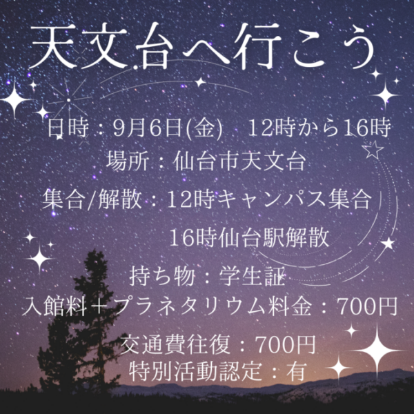 【持ち物・参加費】学生証・交通費700円・入館料+プラネタリウム料700円