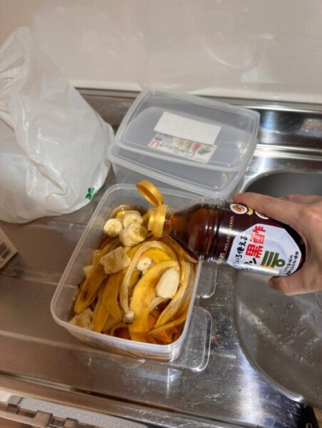 まずは、カブトムシを捕まえるためのトラップを仕掛けるためにキャンパス長が手製の樹液を作っています🍌
