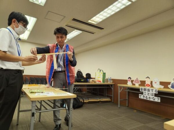 生徒が準備してくださった輪ゴム鉄砲を使って的に当てます!!