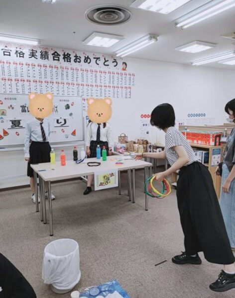 輪投げでは小さな輪を上手にピンに見立てたペットボトルに入れることができていた子も…!